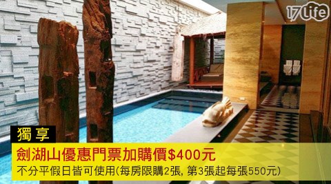 獨享!加購劍湖山世界門票400元/張,不分平假日皆可使用。